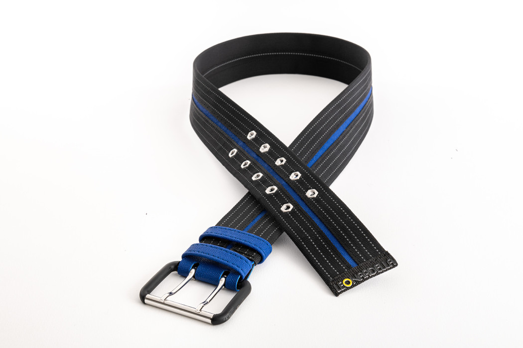 Gürtel Breite 54 mm Länge S, M, L, XL, XXL PES-Band mit 7 reflektierenden Streifen / fixiert Kunstleder Streifen Sechseck-Ösen weißbronze dickere Stärke Schnalle matt schwarz lackiert Nickelfrei Lieferzeit 1–2 Wochen für dieses Produkt LEONARDELLA formlos per eMail kontaktieren: ✓